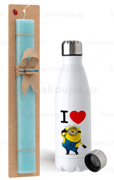 I love by minion, Πασχαλινή Λαμπάδα με μεταλλικό παγούρι ανοξείδωτο (750ml) & κερί αρωματικό πλακέ (30cm) (ΤΙΡΚΟΥΑΖ)