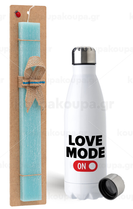 LOVE MODE ON, Πασχαλινή Λαμπάδα με μεταλλικό παγούρι ανοξείδωτο (750ml) & κερί αρωματικό πλακέ (30cm) (ΤΙΡΚΟΥΑΖ)