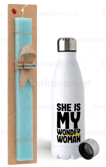 She is my wonder woman, Πασχαλινή Λαμπάδα με μεταλλικό παγούρι ανοξείδωτο (750ml) & κερί αρωματικό πλακέ (30cm) (ΤΙΡΚΟΥΑΖ)