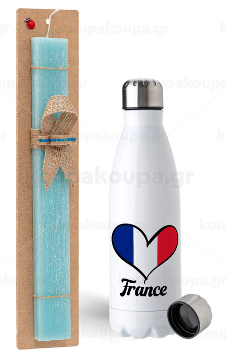 France flag, Πασχαλινή Λαμπάδα με μεταλλικό παγούρι ανοξείδωτο (750ml) & κερί αρωματικό πλακέ (30cm) (ΤΙΡΚΟΥΑΖ)