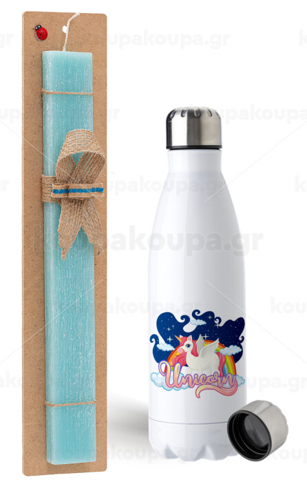 Μονόκερος, Πασχαλινή Λαμπάδα με μεταλλικό παγούρι ανοξείδωτο (750ml) & κερί αρωματικό πλακέ (30cm) (ΤΙΡΚΟΥΑΖ)