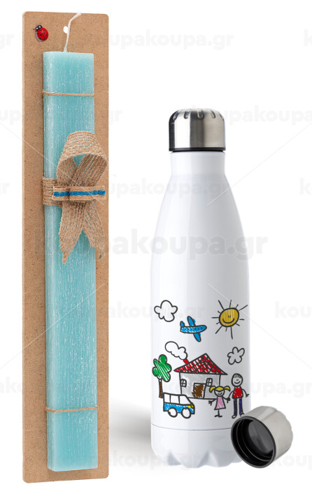 Παιδική ζωγραφιά, Πασχαλινή Λαμπάδα με μεταλλικό παγούρι ανοξείδωτο (750ml) & κερί αρωματικό πλακέ (30cm) (ΤΙΡΚΟΥΑΖ)