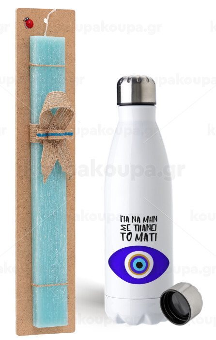 Για να μην σε πιάνει το μάτι, Πασχαλινή Λαμπάδα με μεταλλικό παγούρι ανοξείδωτο (750ml) & κερί αρωματικό πλακέ (30cm) (ΤΙΡΚΟΥΑΖ)