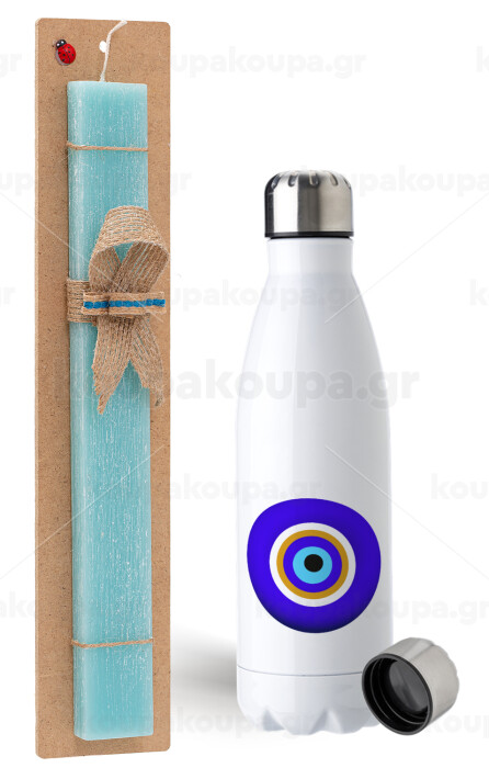 Το μάτι, Πασχαλινή Λαμπάδα με μεταλλικό παγούρι ανοξείδωτο (750ml) & κερί αρωματικό πλακέ (30cm) (ΤΙΡΚΟΥΑΖ)