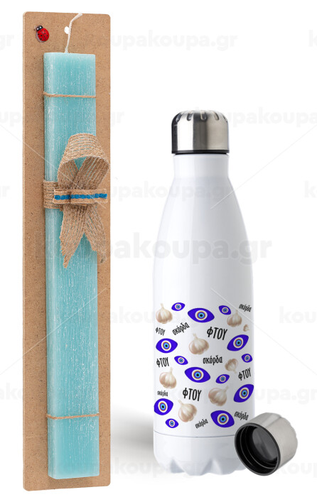 Φτου, φτου, σκόρδα!!!, Πασχαλινή Λαμπάδα με μεταλλικό παγούρι ανοξείδωτο (750ml) & κερί αρωματικό πλακέ (30cm) (ΤΙΡΚΟΥΑΖ)
