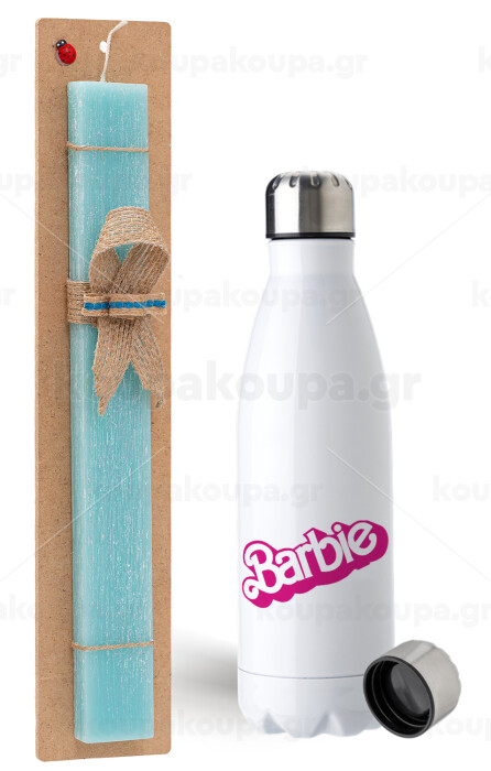 Barbie, Πασχαλινή Λαμπάδα με μεταλλικό παγούρι ανοξείδωτο (750ml) & κερί αρωματικό πλακέ (30cm) (ΤΙΡΚΟΥΑΖ)
