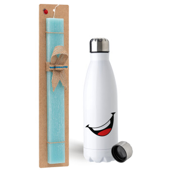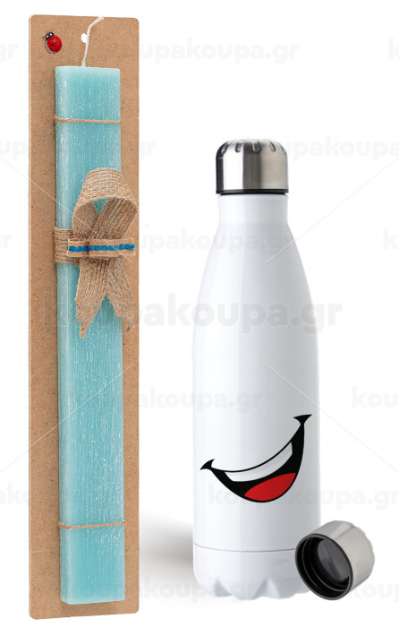 Φατσούλα γελάω!!!, Πασχαλινή Λαμπάδα με μεταλλικό παγούρι ανοξείδωτο (750ml) & κερί αρωματικό πλακέ (30cm) (ΤΙΡΚΟΥΑΖ)