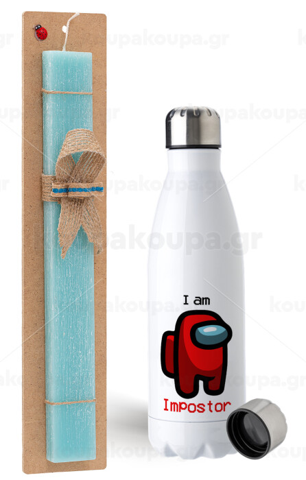 Among US i am impostor, Πασχαλινή Λαμπάδα με μεταλλικό παγούρι ανοξείδωτο (750ml) & κερί αρωματικό πλακέ (30cm) (ΤΙΡΚΟΥΑΖ)