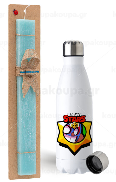 Brawl Stars El primo, Πασχαλινή Λαμπάδα με μεταλλικό παγούρι ανοξείδωτο (750ml) & κερί αρωματικό πλακέ (30cm) (ΤΙΡΚΟΥΑΖ)