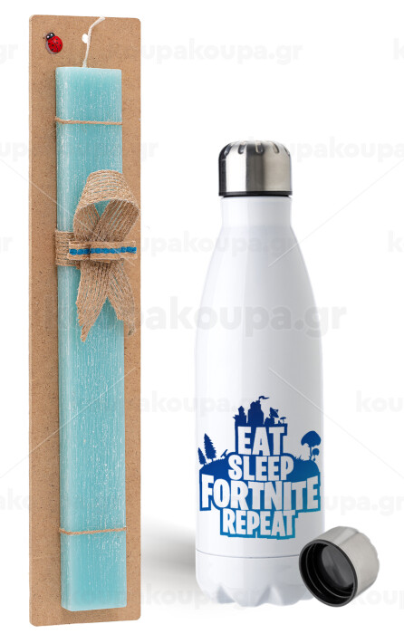 Eat Sleep Fortnite Repeat, Πασχαλινή Λαμπάδα με μεταλλικό παγούρι ανοξείδωτο (750ml) & κερί αρωματικό πλακέ (30cm) (ΤΙΡΚΟΥΑΖ)