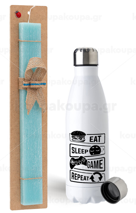 Eat Sleep Game Repeat, Πασχαλινή Λαμπάδα με μεταλλικό παγούρι ανοξείδωτο (750ml) & κερί αρωματικό πλακέ (30cm) (ΤΙΡΚΟΥΑΖ)
