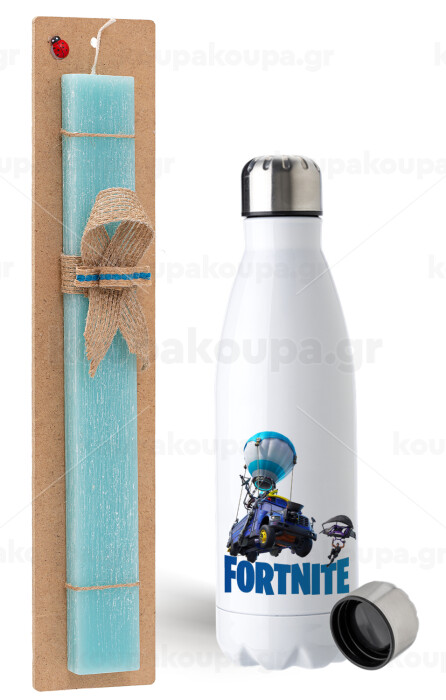 Fortnite Bus, Πασχαλινή Λαμπάδα με μεταλλικό παγούρι ανοξείδωτο (750ml) & κερί αρωματικό πλακέ (30cm) (ΤΙΡΚΟΥΑΖ)