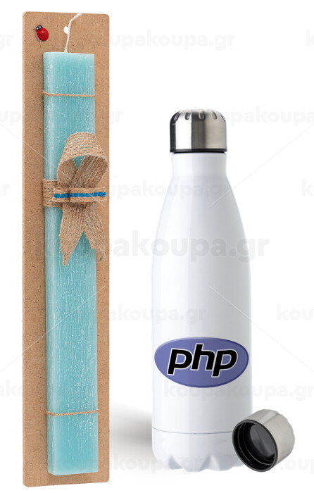 PHP, Πασχαλινή Λαμπάδα με μεταλλικό παγούρι ανοξείδωτο (750ml) & κερί αρωματικό πλακέ (30cm) (ΤΙΡΚΟΥΑΖ)