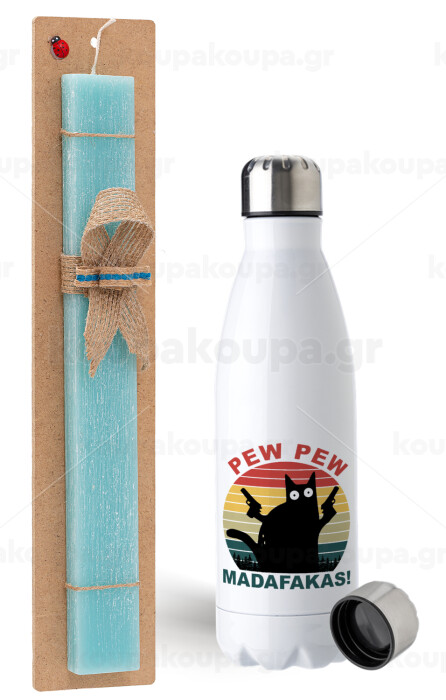 PEW PEW madafakas, Πασχαλινή Λαμπάδα με μεταλλικό παγούρι ανοξείδωτο (750ml) & κερί αρωματικό πλακέ (30cm) (ΤΙΡΚΟΥΑΖ)