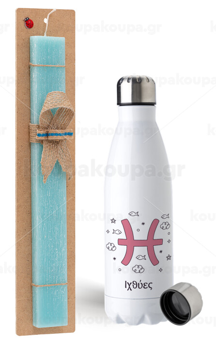 Ζώδια Ιχθύες, Πασχαλινή Λαμπάδα με μεταλλικό παγούρι ανοξείδωτο (750ml) & κερί αρωματικό πλακέ (30cm) (ΤΙΡΚΟΥΑΖ)