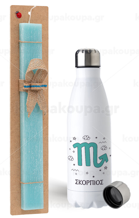 Ζώδια Σκορπιός, Πασχαλινή Λαμπάδα με μεταλλικό παγούρι ανοξείδωτο (750ml) & κερί αρωματικό πλακέ (30cm) (ΤΙΡΚΟΥΑΖ)