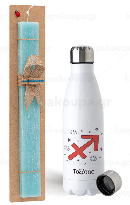 Ζώδια Τοξότης, Πασχαλινή Λαμπάδα με μεταλλικό παγούρι ανοξείδωτο (750ml) & κερί αρωματικό πλακέ (30cm) (ΤΙΡΚΟΥΑΖ)