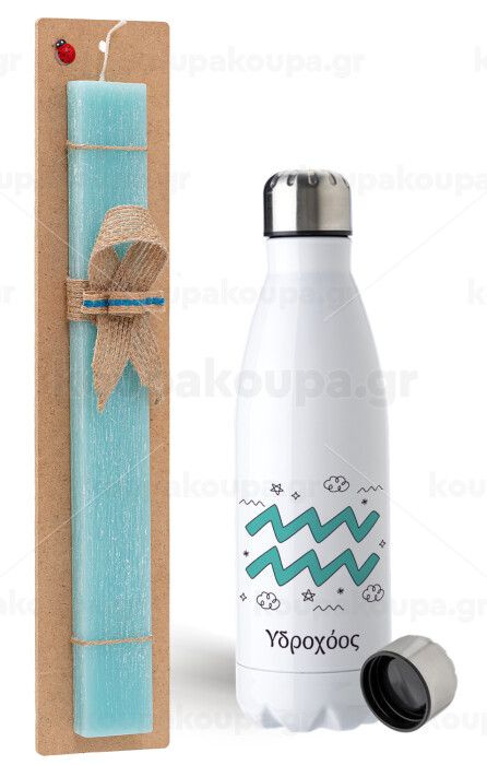 Ζώδια Υδροχόος, Πασχαλινή Λαμπάδα με μεταλλικό παγούρι ανοξείδωτο (750ml) & κερί αρωματικό πλακέ (30cm) (ΤΙΡΚΟΥΑΖ)