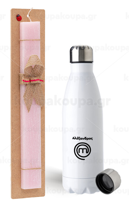 Master Chef Greece, Πασχαλινή Λαμπάδα με μεταλλικό παγούρι ανοξείδωτο (750ml) & κερί αρωματικό πλακέ (30cm) (ΡΟΖ)