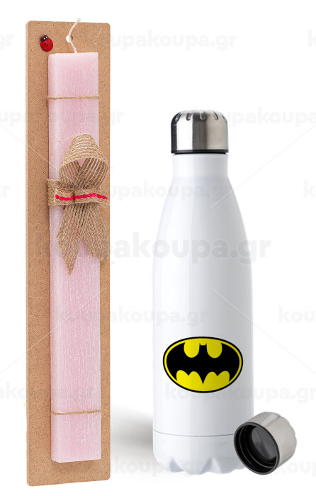 Batman, Πασχαλινή Λαμπάδα με μεταλλικό παγούρι ανοξείδωτο (750ml) & κερί αρωματικό πλακέ (30cm) (ΡΟΖ)