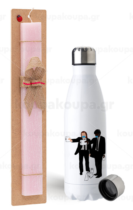 Pulp Fiction 3 meter away, Πασχαλινή Λαμπάδα με μεταλλικό παγούρι ανοξείδωτο (750ml) & κερί αρωματικό πλακέ (30cm) (ΡΟΖ)