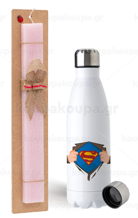 Superman hands, Πασχαλινή Λαμπάδα με μεταλλικό παγούρι ανοξείδωτο (750ml) & κερί αρωματικό πλακέ (30cm) (ΡΟΖ)