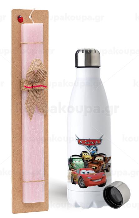 Αυτοκίνητα, Πασχαλινή Λαμπάδα με μεταλλικό παγούρι ανοξείδωτο (750ml) & κερί αρωματικό πλακέ (30cm) (ΡΟΖ)