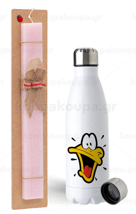 Daffy Duck, Πασχαλινή Λαμπάδα με μεταλλικό παγούρι ανοξείδωτο (750ml) & κερί αρωματικό πλακέ (30cm) (ΡΟΖ)