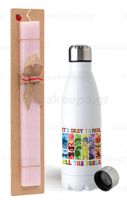 Inside Out It's Okay To Feel All The Feels , Πασχαλινή Λαμπάδα με μεταλλικό παγούρι ανοξείδωτο (750ml) & κερί αρωματικό πλακέ (30cm) (ΡΟΖ)