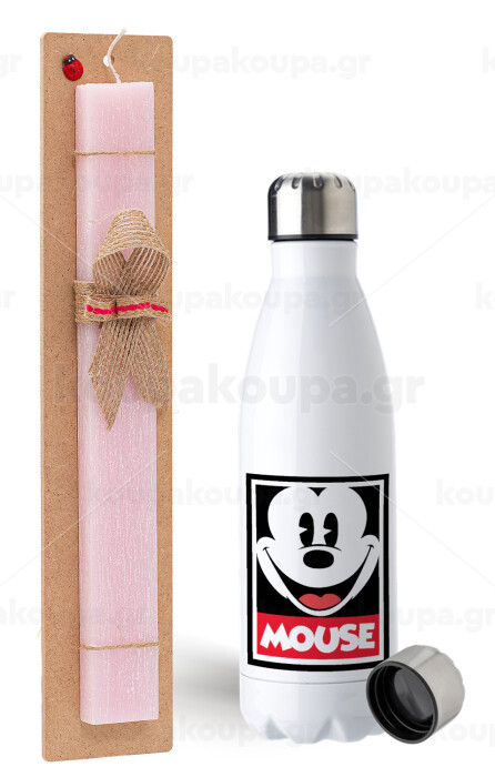 Μίκυ Μάους, Πασχαλινή Λαμπάδα με μεταλλικό παγούρι ανοξείδωτο (750ml) & κερί αρωματικό πλακέ (30cm) (ΡΟΖ)