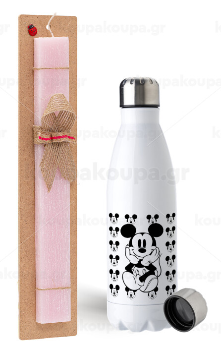 Mickey, Πασχαλινή Λαμπάδα με μεταλλικό παγούρι ανοξείδωτο (750ml) & κερί αρωματικό πλακέ (30cm) (ΡΟΖ)