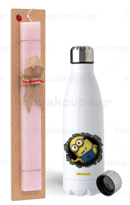 Minions hi, Πασχαλινή Λαμπάδα με μεταλλικό παγούρι ανοξείδωτο (750ml) & κερί αρωματικό πλακέ (30cm) (ΡΟΖ)