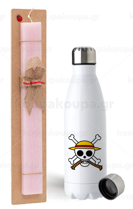 Onepiece skull, Πασχαλινή Λαμπάδα με μεταλλικό παγούρι ανοξείδωτο (750ml) & κερί αρωματικό πλακέ (30cm) (ΡΟΖ)