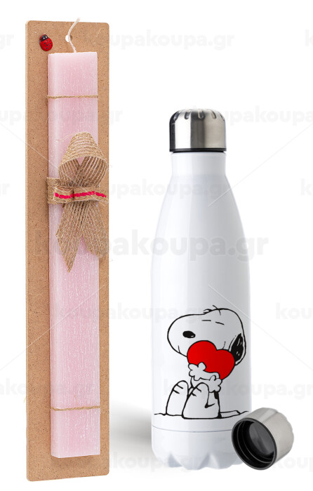 Snoopy, Πασχαλινή Λαμπάδα με μεταλλικό παγούρι ανοξείδωτο (750ml) & κερί αρωματικό πλακέ (30cm) (ΡΟΖ)
