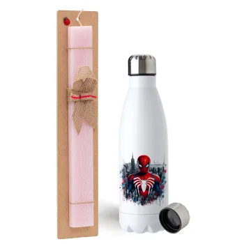 Spiderman City, Πασχαλινή Λαμπάδα με μεταλλικό παγούρι ανοξείδωτο (750ml) & κερί αρωματικό πλακέ (30cm) (ΡΟΖ)