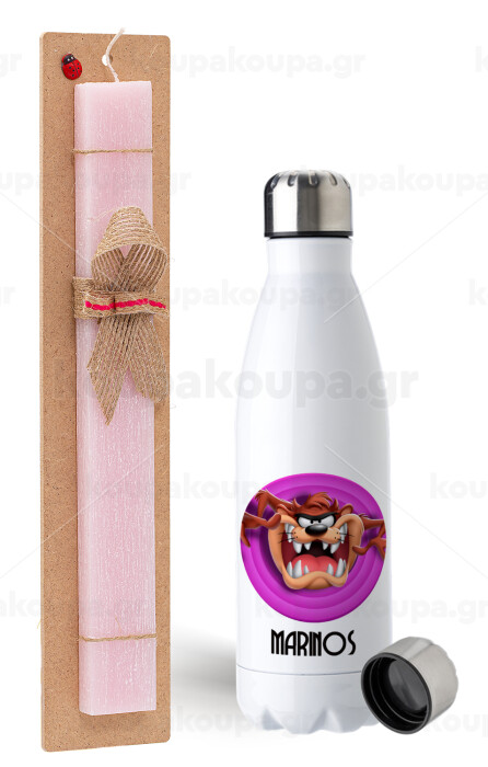 Taz, Πασχαλινή Λαμπάδα με μεταλλικό παγούρι ανοξείδωτο (750ml) & κερί αρωματικό πλακέ (30cm) (ΡΟΖ)