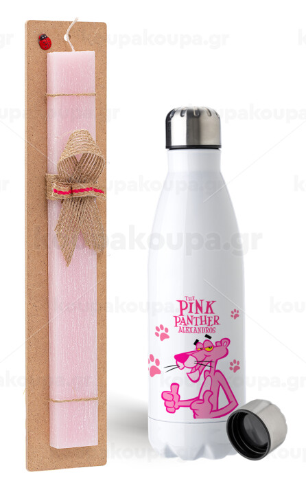 The pink panther, Πασχαλινή Λαμπάδα με μεταλλικό παγούρι ανοξείδωτο (750ml) & κερί αρωματικό πλακέ (30cm) (ΡΟΖ)