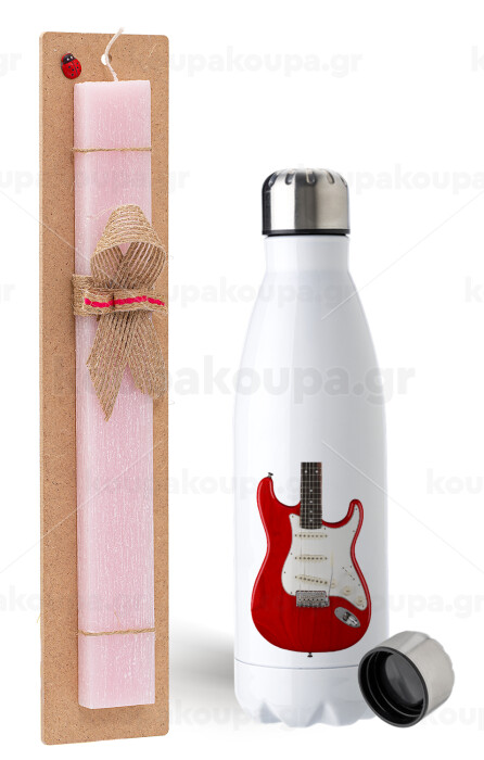 Guitar stratocaster, Πασχαλινή Λαμπάδα με μεταλλικό παγούρι ανοξείδωτο (750ml) & κερί αρωματικό πλακέ (30cm) (ΡΟΖ)