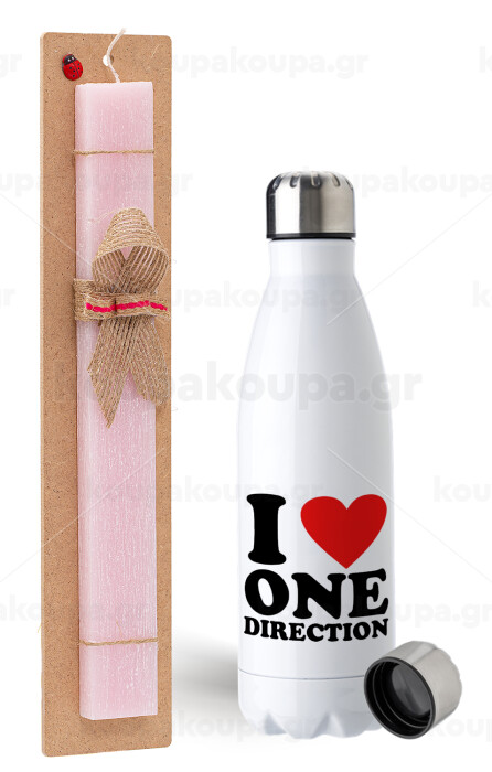 I Love, One Direction, Πασχαλινή Λαμπάδα με μεταλλικό παγούρι ανοξείδωτο (750ml) & κερί αρωματικό πλακέ (30cm) (ΡΟΖ)
