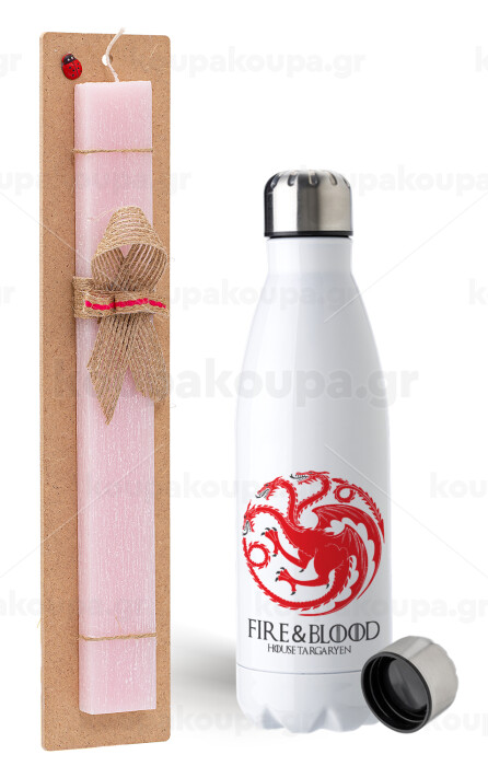 GOT House Targaryen, Fire Blood, Πασχαλινή Λαμπάδα με μεταλλικό παγούρι ανοξείδωτο (750ml) & κερί αρωματικό πλακέ (30cm) (ΡΟΖ)