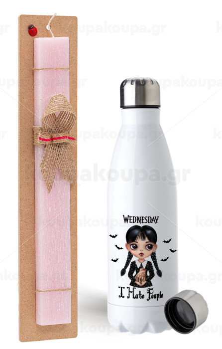 Wednesday Adams, i hate people, Πασχαλινή Λαμπάδα με μεταλλικό παγούρι ανοξείδωτο (750ml) & κερί αρωματικό πλακέ (30cm) (ΡΟΖ)