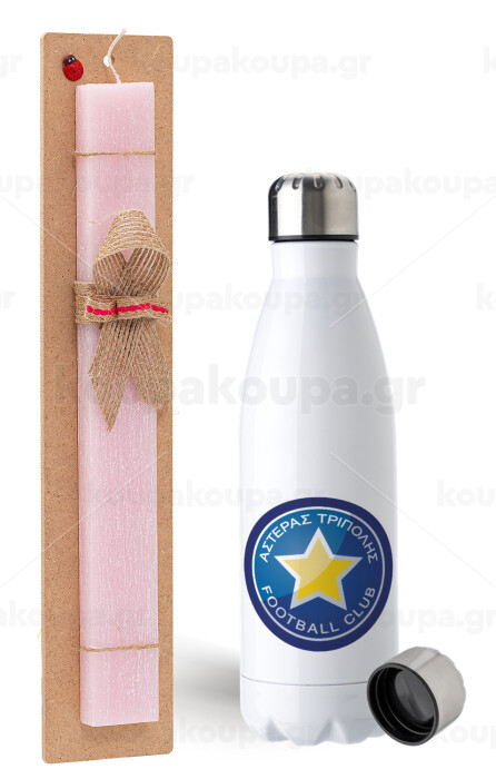 Αστέρας Τρίπολης, Πασχαλινή Λαμπάδα με μεταλλικό παγούρι ανοξείδωτο (750ml) & κερί αρωματικό πλακέ (30cm) (ΡΟΖ)