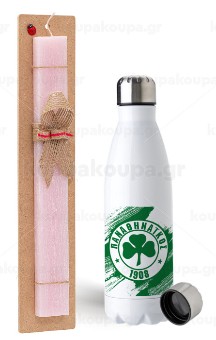 Π.Α.Ο., Πασχαλινή Λαμπάδα με μεταλλικό παγούρι ανοξείδωτο (750ml) & κερί αρωματικό πλακέ (30cm) (ΡΟΖ)
