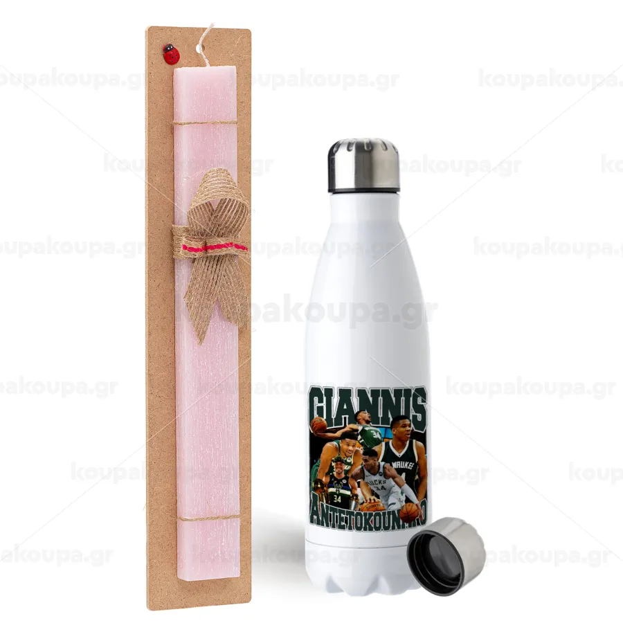 Giannis Antetokounmpo, Πασχαλινή Λαμπάδα με μεταλλικό παγούρι ανοξείδωτο (750ml) & κερί αρωματικό πλακέ (30cm) (ΡΟΖ)