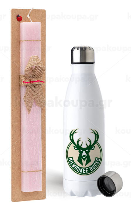 Milwaukee bucks, Πασχαλινή Λαμπάδα με μεταλλικό παγούρι ανοξείδωτο (750ml) & κερί αρωματικό πλακέ (30cm) (ΡΟΖ)