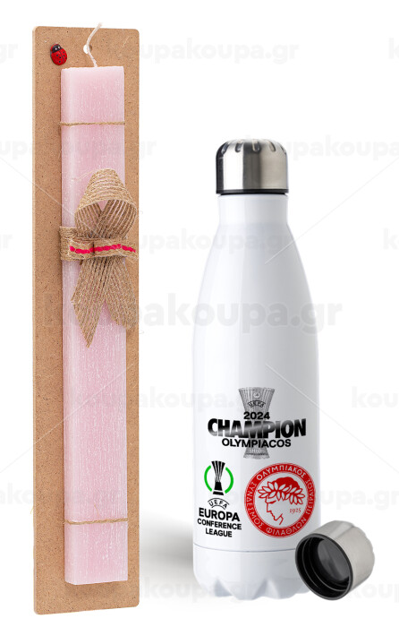 Olympiacos UEFA Europa Conference League Champion 2024, Πασχαλινή Λαμπάδα με μεταλλικό παγούρι ανοξείδωτο (750ml) & κερί αρωματικό πλακέ (30cm) (ΡΟΖ)