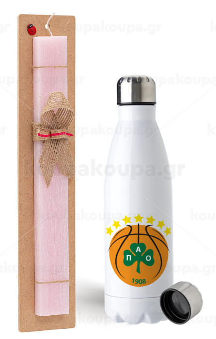 ΠΑΟ BC, Πασχαλινή Λαμπάδα με μεταλλικό παγούρι ανοξείδωτο (750ml) & κερί αρωματικό πλακέ (30cm) (ΡΟΖ)