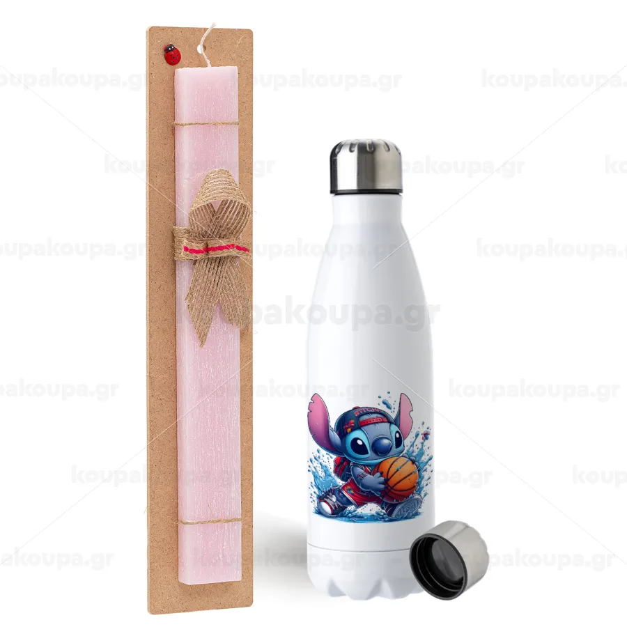 Stitch Basketball, Πασχαλινή Λαμπάδα με μεταλλικό παγούρι ανοξείδωτο (750ml) & κερί αρωματικό πλακέ (30cm) (ΡΟΖ)