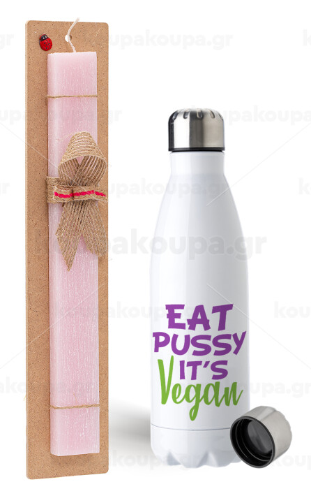 EAT pussy it's vegan, Πασχαλινή Λαμπάδα με μεταλλικό παγούρι ανοξείδωτο (750ml) & κερί αρωματικό πλακέ (30cm) (ΡΟΖ)