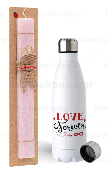 Love forever ∞, Πασχαλινή Λαμπάδα με μεταλλικό παγούρι ανοξείδωτο (750ml) & κερί αρωματικό πλακέ (30cm) (ΡΟΖ)